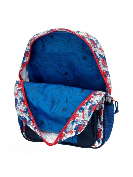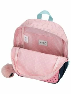 Bolsillo frontal para mejorar la organización de los pequeños accesorios y el material escolar y dos bolsillos laterales para guardar la botella de agua y el paraguas.