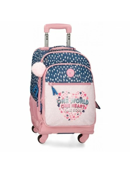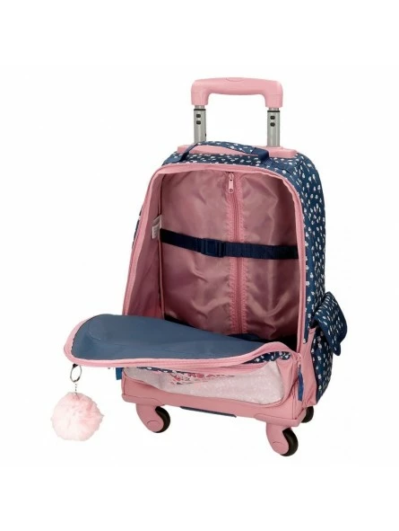 Mochila de 32×43 cm. (57 cm. incluyendo ruedas y tirador recogido)x21 cm. fabricada en poliéster.