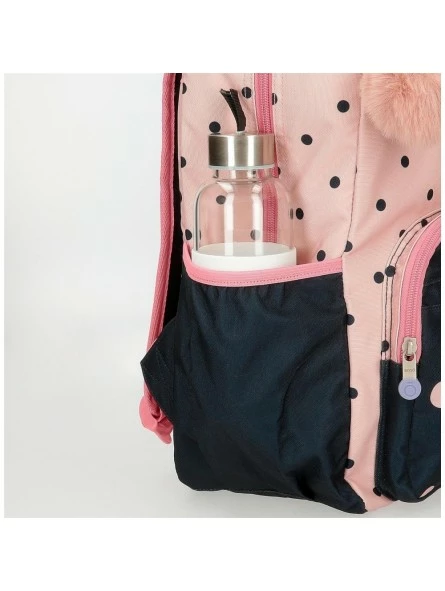 Bolsillo frontal para los pequeños accesorios y el material escolar y dos bolsillos laterales para guardar la botella y el paraguas.