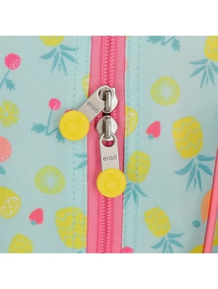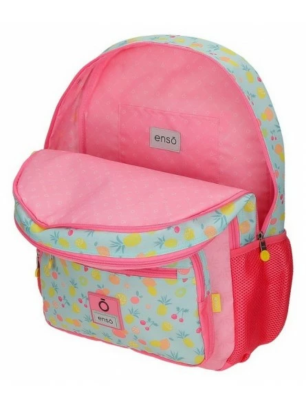 Dos bolsillos frontales para mejorar la organización de los pequeños accesorios y el material escolar y dos bolsillos laterales para guardar la botella de agua y el paraguas.